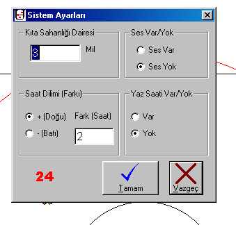 | Ayarlar tablosuna 8 nolu butona basılarak ulaşılır. Kıtasahanlığı: Teknenin çevresinde istenen uzaklıkta bir daire çizdirilebilir. Örneğin 30 mil yazıldığında tekne çevresinde 30 mil yarıçaplı kırmızı bir cember çizilecektir. Bununla 30 mil uzaktaki bir ülkenin kıtasahanlığına girilip girilmedığı kolayca anlaşılır. Saat Dilimi: Greenwich e göre saat farkı daima doğu ve 2 saat olmalıdır. Ses var yok: Marka alarmı açık olduğunda ayarlı mesafeye girildiğinde sesle uyarı yapar. Yaz Saati: Yaz saati uygulaması olduğunda “var” kutusu işaretlenmelidir. |